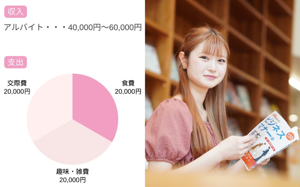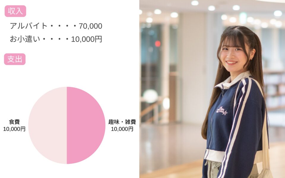 休日はアルバイトに行くことが多いです。自由な時間には家でゆっくり過ごしたり、図書館に行って勉強したりしています。