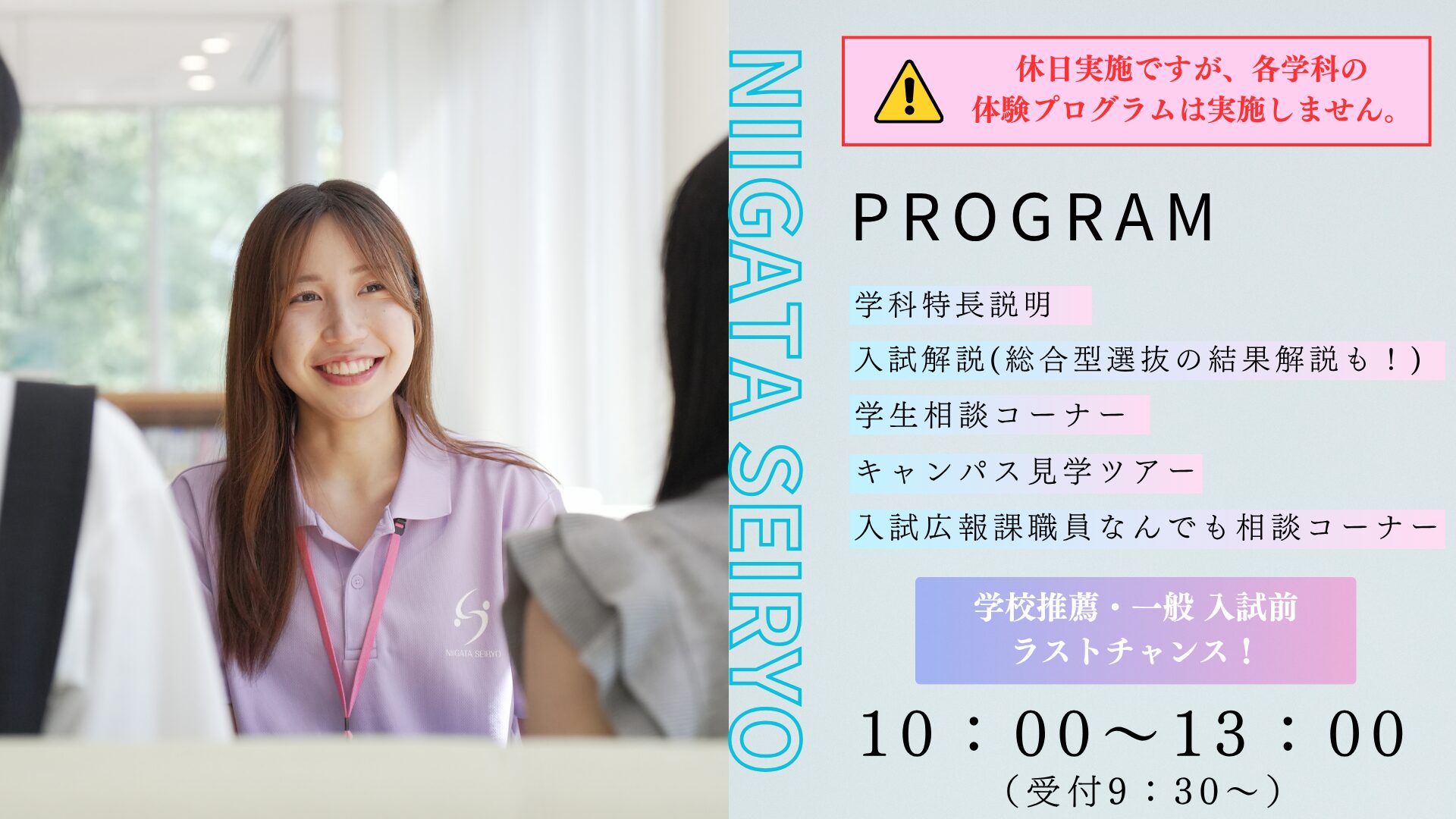 青陵の特長、各分野の学び、学生生活、入試、学校の雰囲気、サポート体制、お金に関することなど、新潟青陵の『なんでも』をこの機会に来て、見てください!