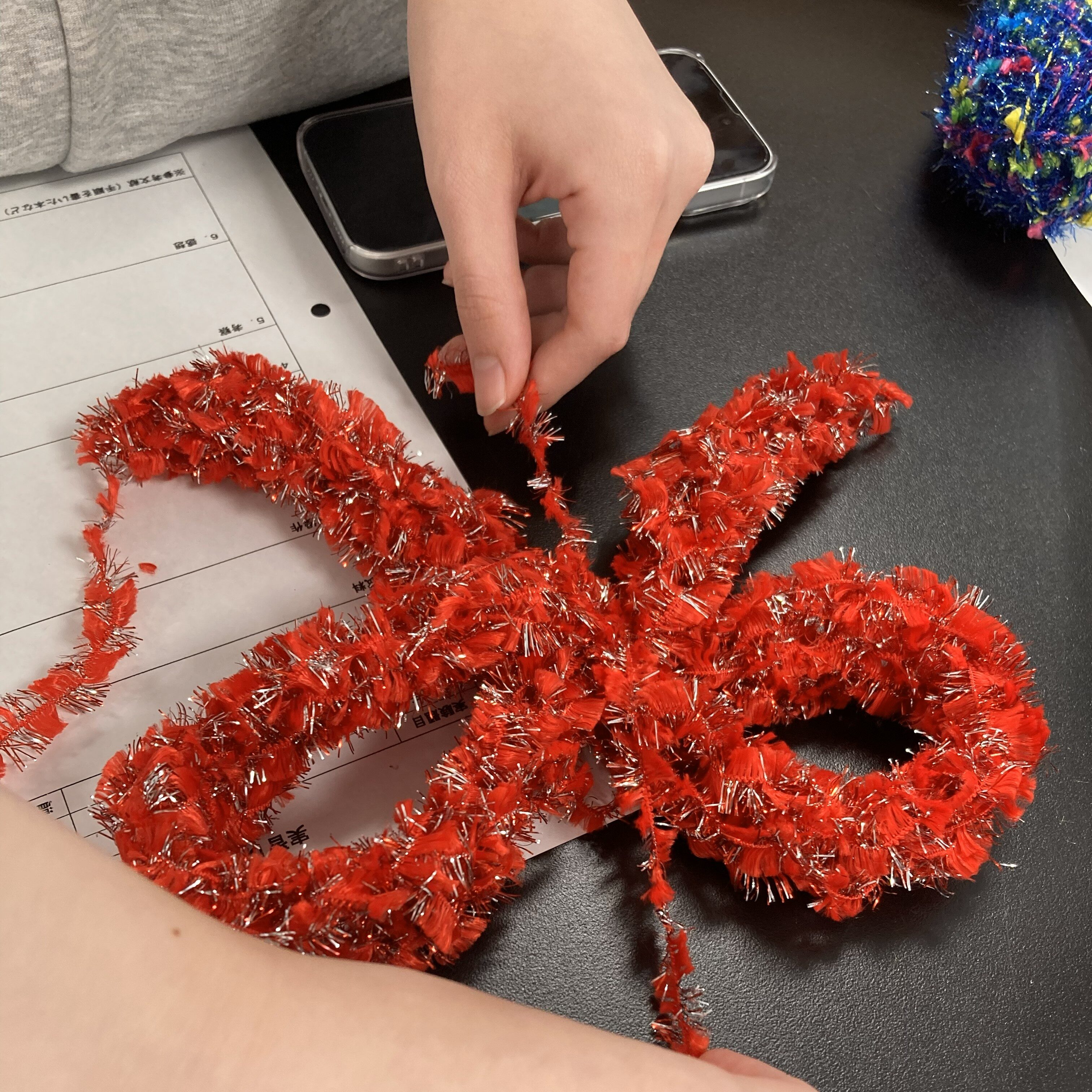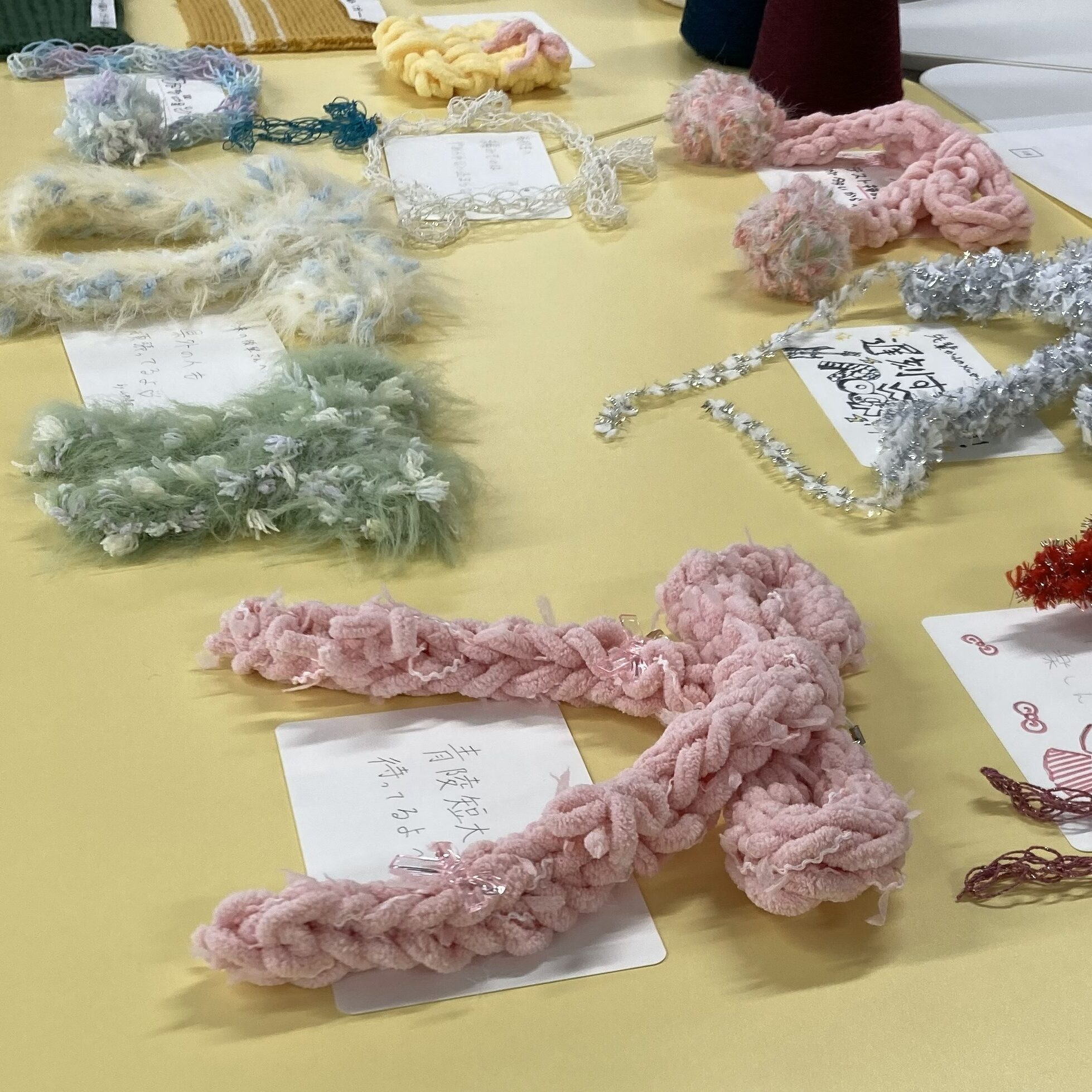 写真は、ファンシーヤーンを使って、指編みを体験しているところです。実物にふれながら、素材について楽しく、実用的に学んでいきましょう。