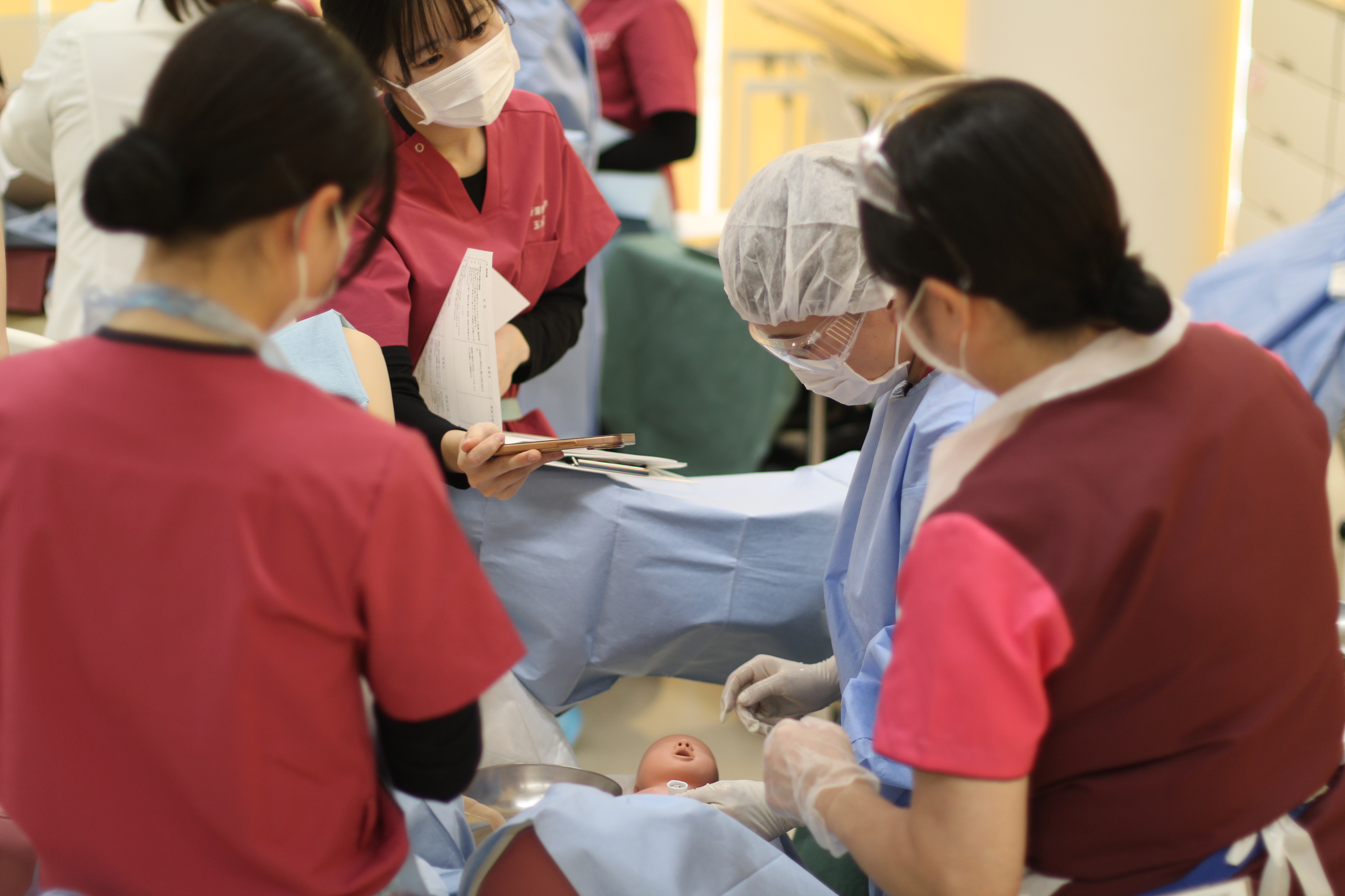 実習初期は、指導助産師に手を添えてもらいながら実践し、例数を重ねる中で、段階的に自立した対応ができるよう支援体制が整えられています。