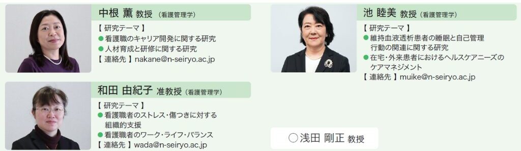 - 看護管理学に必要な基礎的知識体系を修得し、教育・研究・実践と調和のとれた役割を担い、生涯にわたって学術的視点で研究活動ができる看護管理者を育成します。