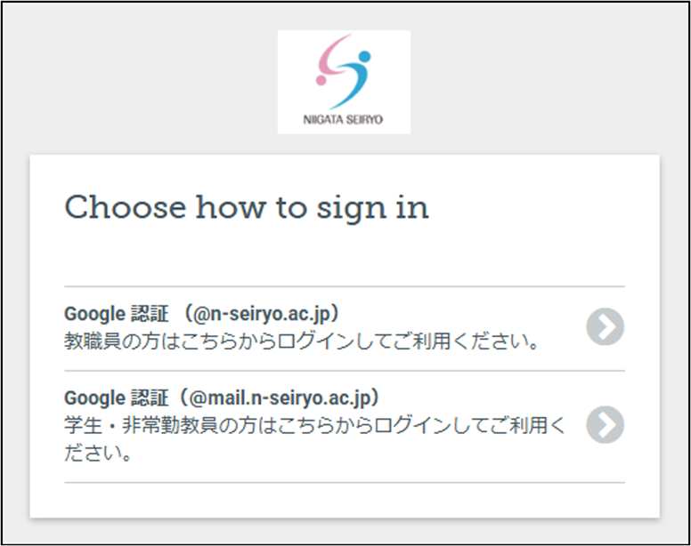 - 認証画面が表示されたらGoogle認証を選択し、大学のGmailで認証してログインする。